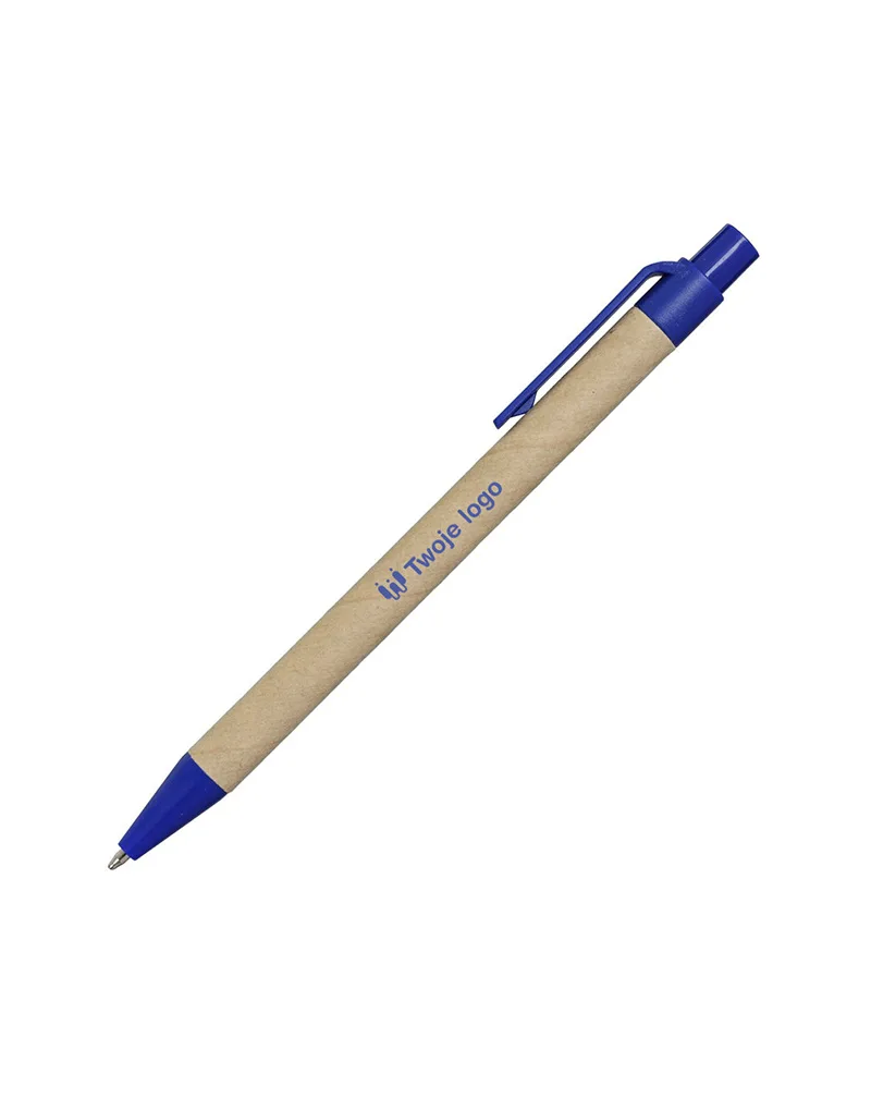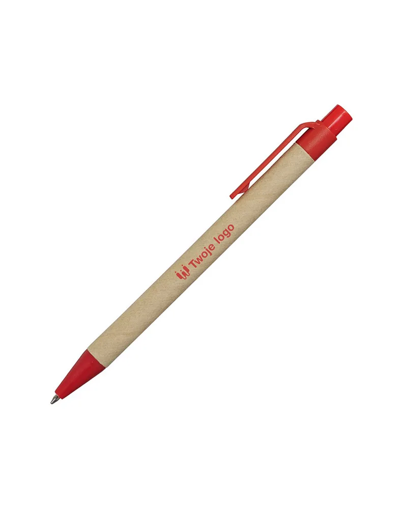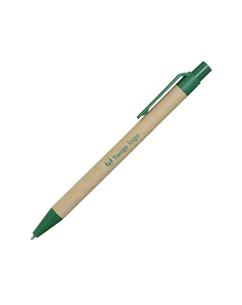 Długopis kartonowy EKO jest wykonany z kartonu z recyklingu, przycisk i końcówka z plastiku nadającego się do ponownego przetworzenia.