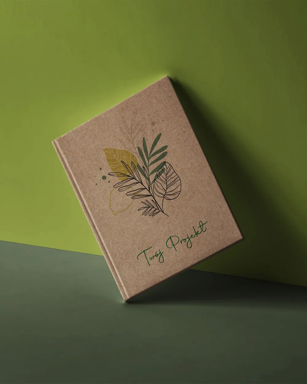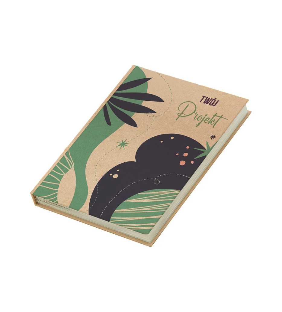 - Oprawa wykonana z twardego, wytrzymałego papieru kraftowego w naturalnym kolorze ciemnego beżu