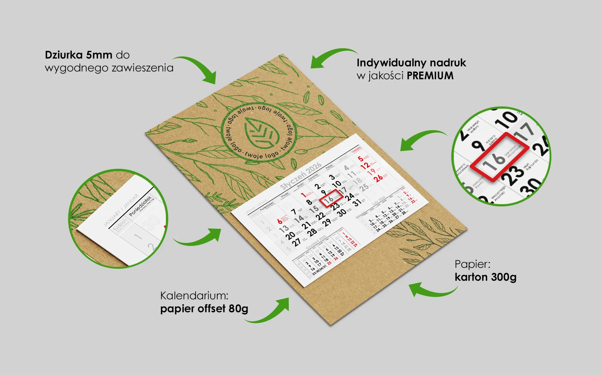 Wykonanie: Posiada indywidualnie drukowaną płaską główkę i plecki, a także odrywane 12 kartkowe kalendarium, które zapewniają pełną funkcjonalność i estetyczny wygląd przez cały rok.