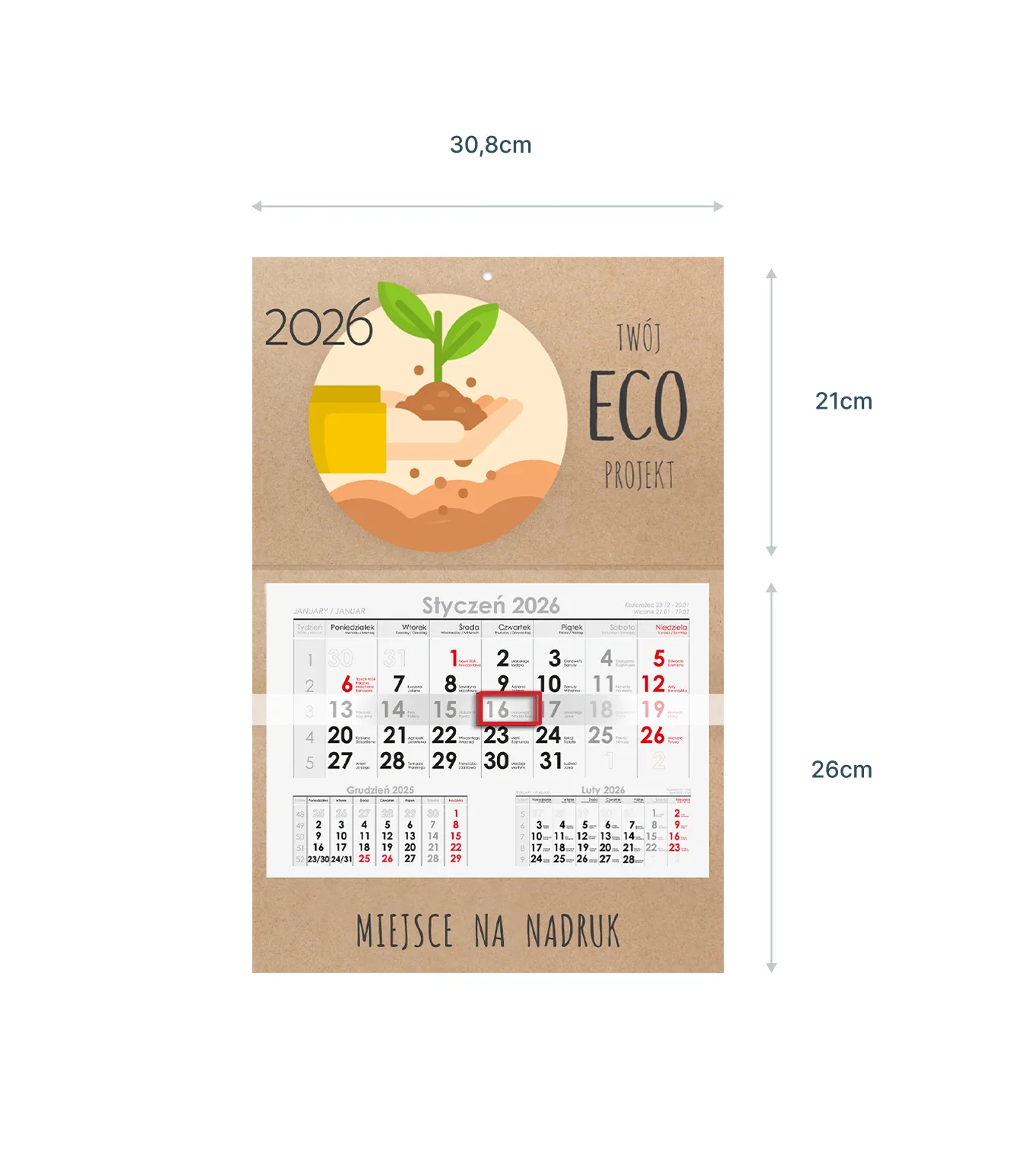 Eko-design: W trosce o środowisko, kalendarz nie zawiera zadruku koloru białego, co podkreśla jego ekologiczny charakter i minimalizuje wpływ na środowisko.