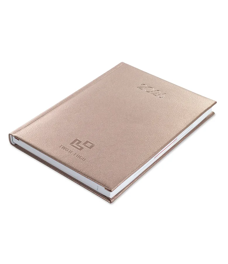Kalendarz książkowy Aurora A5 z logo to oprawa o błyszczącej strukturze.