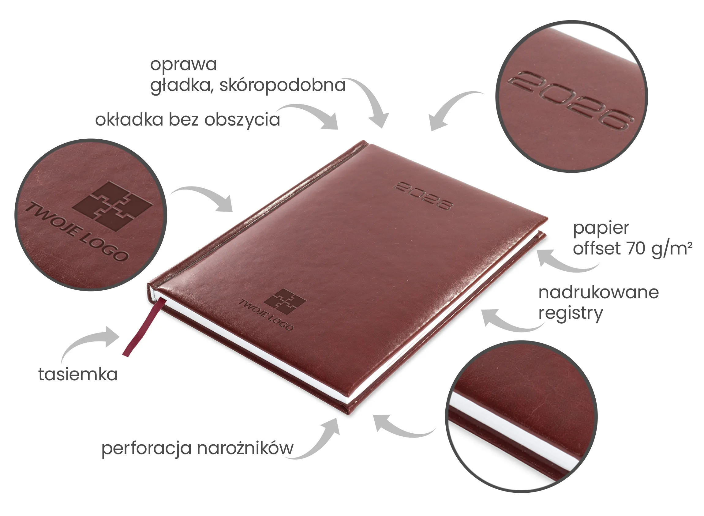 • Druk: standardowo w kolorze szaro-bordowym