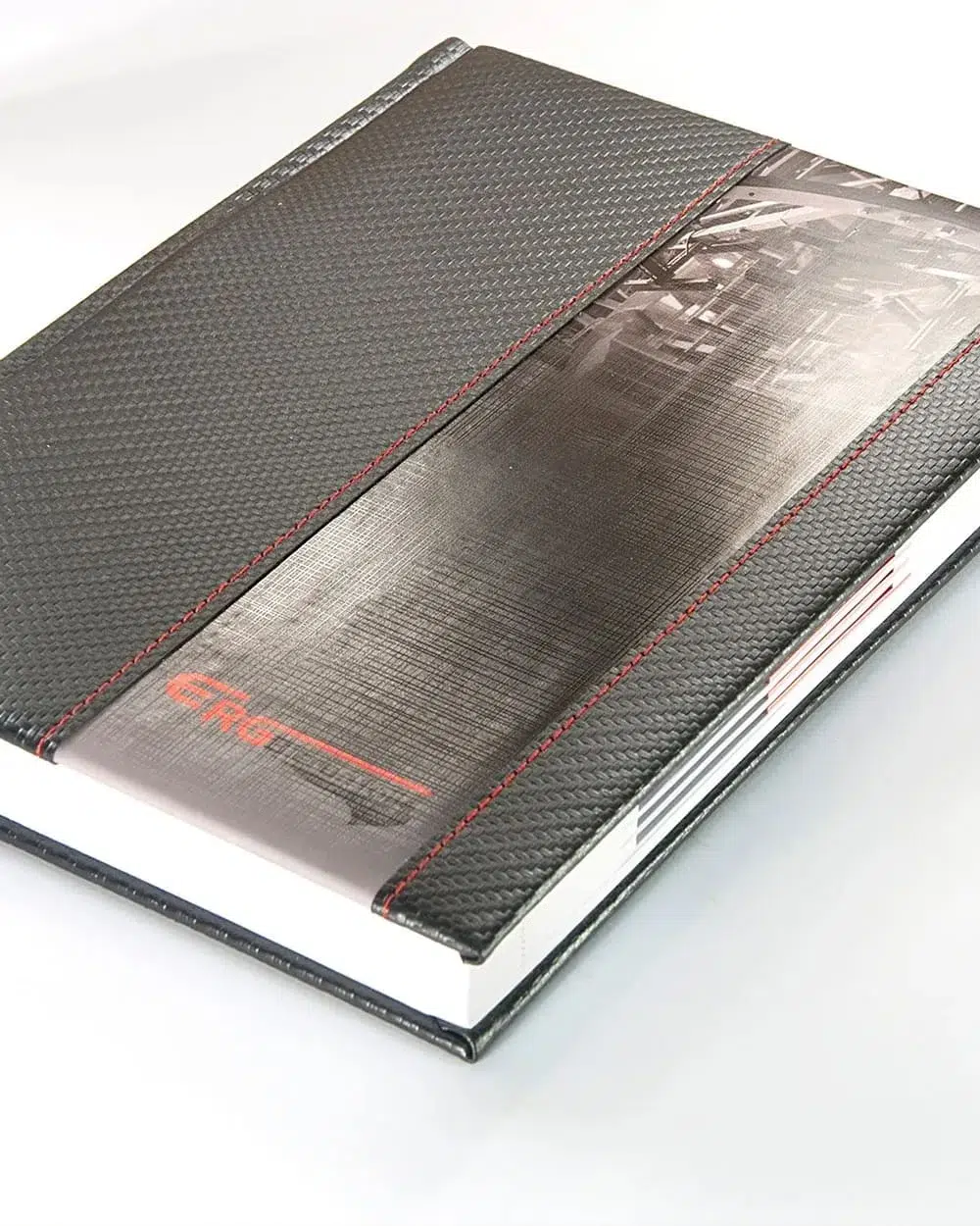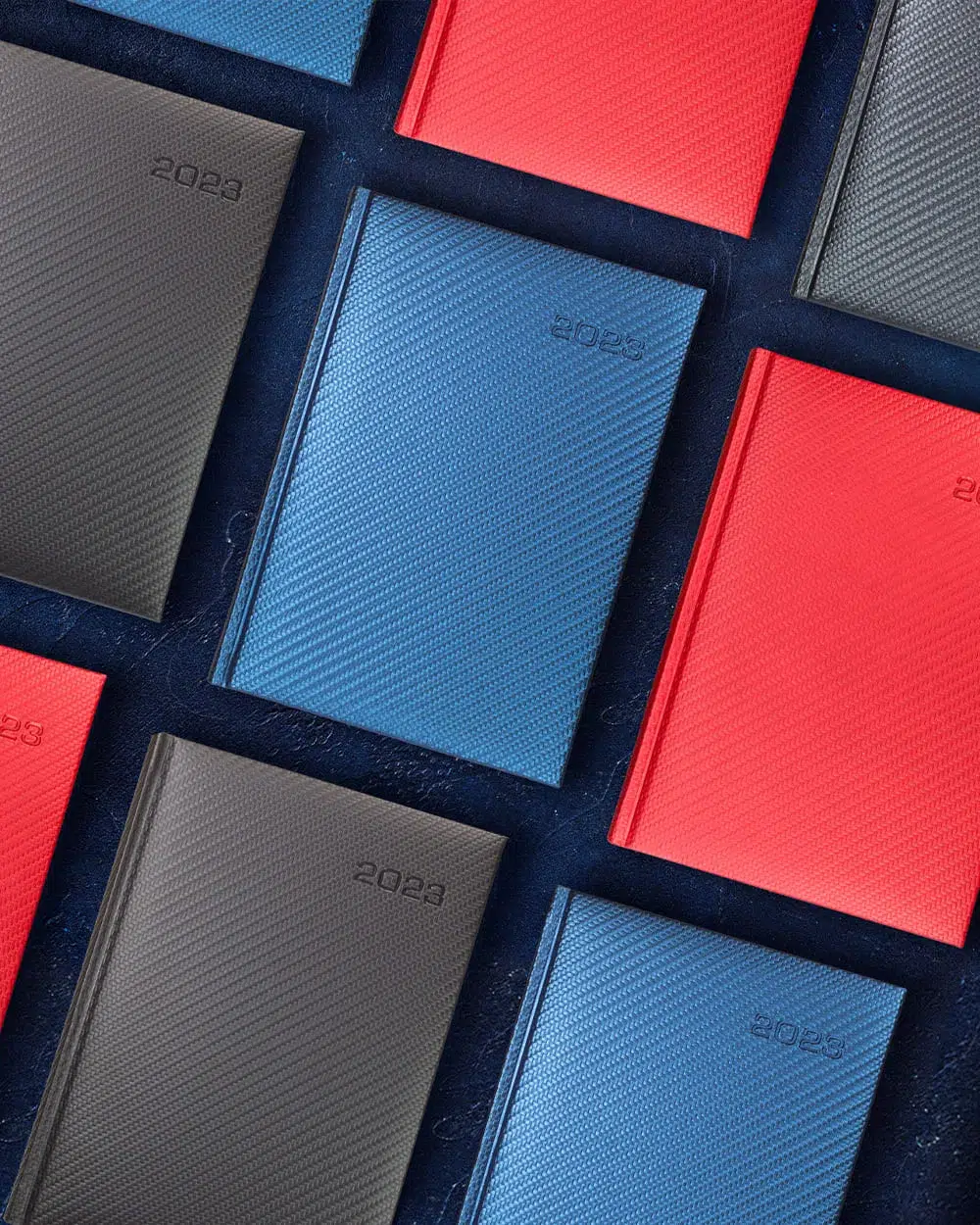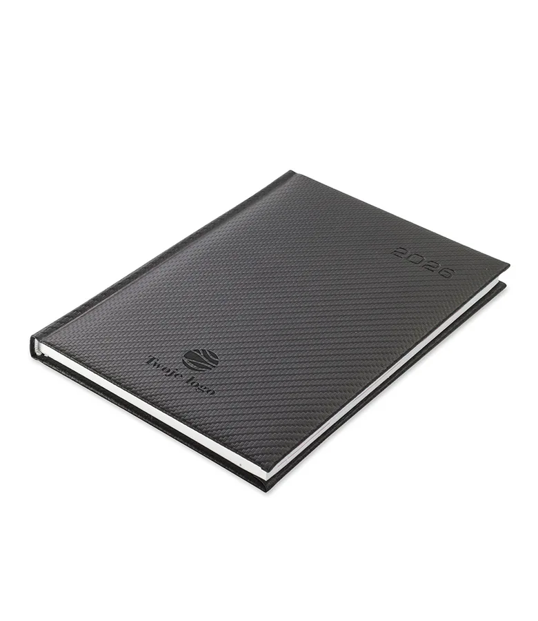 Kalendarz książkowy Bangkok A5 z logo to oprawa posiadająca oprawę o geometrycznej fakturze znanej szerzej jako carbon, która nadaje głębokość i charakterystyczny wygląd.