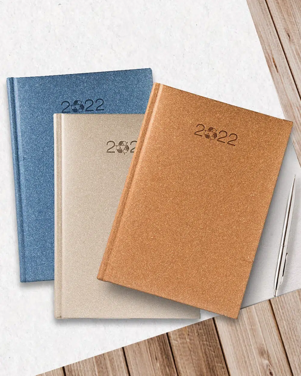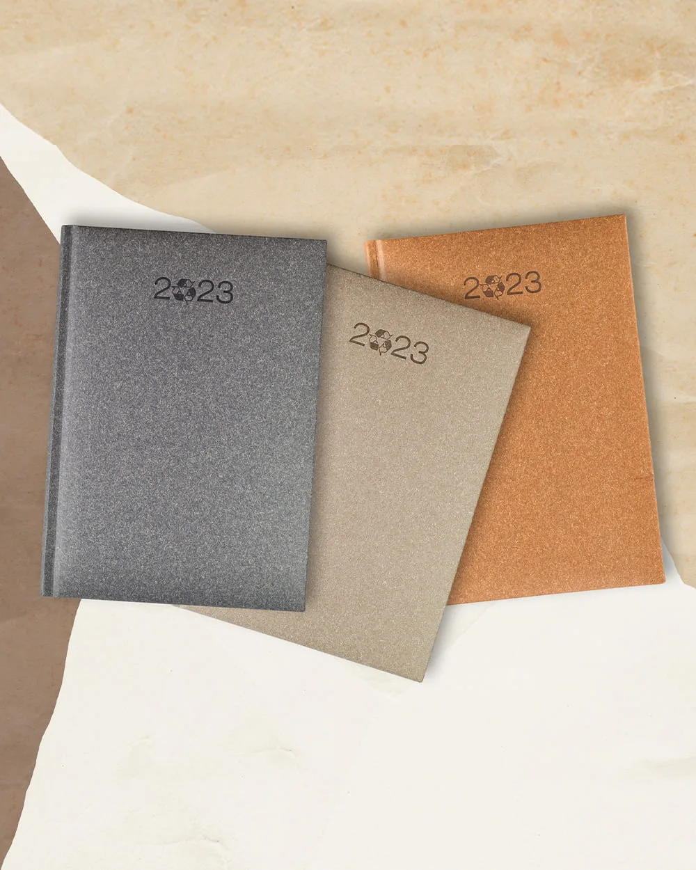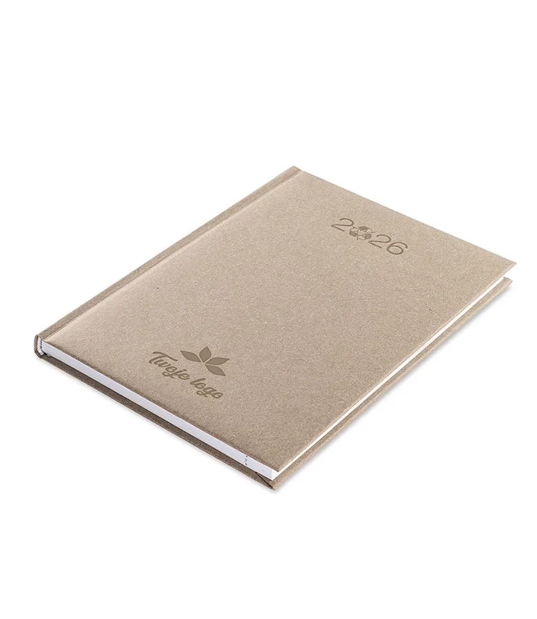 Kalendarz książkowy Bergamo A5 z logo to oprawa z mocnego papieru termoprzebarwialnego o ciekawej „włosowatej” teksturze.