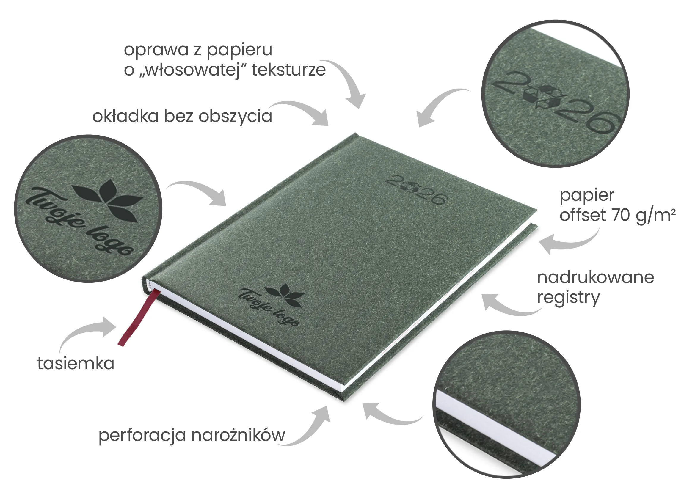 Kalendarz książkowy to nie tylko doskonałe narzędzie do organizacji czasu, planowania i zapisywania codziennych zadań, ale także estetyczny dodatek do Twojego biura czy domu. Zdecydowanie zwiększa on produktywność planowania oraz działania. Dodatkowo dzięki opcji personalizacji logo kalendarze są doskonałą formą całorocznej reklamy, możesz podarować je swoim kontrahentom, partnerom biznesowym, klientom oraz pracownikom. Sprawdzi się również jako podarunek na święta. Jego funkcjonalność i staranne wykonanie sprawią, że będziesz z niego zadowolony przez cały rok! ✨