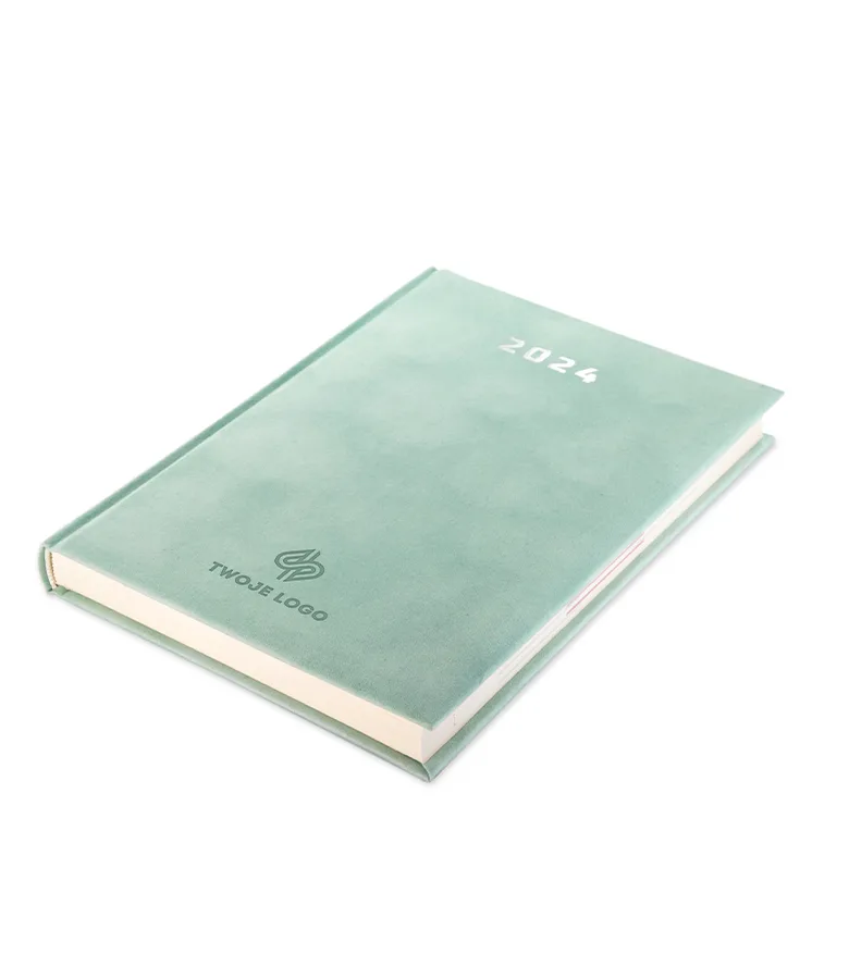 Kalendarz książkowy Flok  A4 z logo  to  model kalendarza z oprawą z materiału o strukturze imitującej flok oprawa jest nieobszyta. Ta oprawa jest wyjątkowo miękka i przyjemna w dotyku.