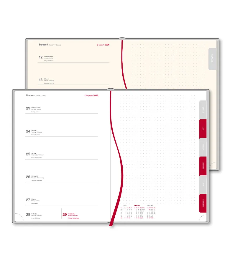 Posiada w wytłoczoną datę na okładce oraz proste narożniki, ten kalendarz jest nie tylko praktyczny, ale także elegancki.