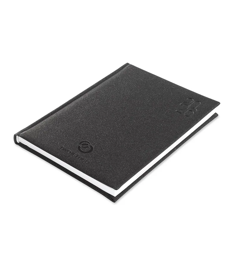Kalendarz książkowy Lazio B5 z logo to model kalendarza z oprawą syntetyczną o delikatnej, iskrzącej się brokatem powierzchni. Oprawa  jest nieobszyta.