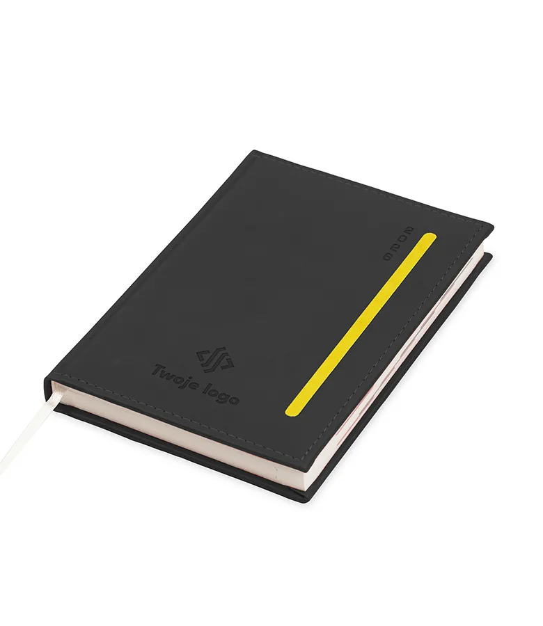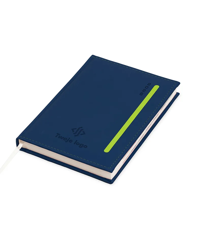 Kalendarz książkowy Line A5 z logo to model kalendarza z oprawą łączoną , który zachwyca swoją matową oprawą wykonaną z materiału skóropodobnego z dodatkową linią z oprawy soft touch. Posiada w wytłoczoną datę na okładce oraz proste narożniki, ten kalendarz jest nie tylko praktyczny, ale także elegancki.