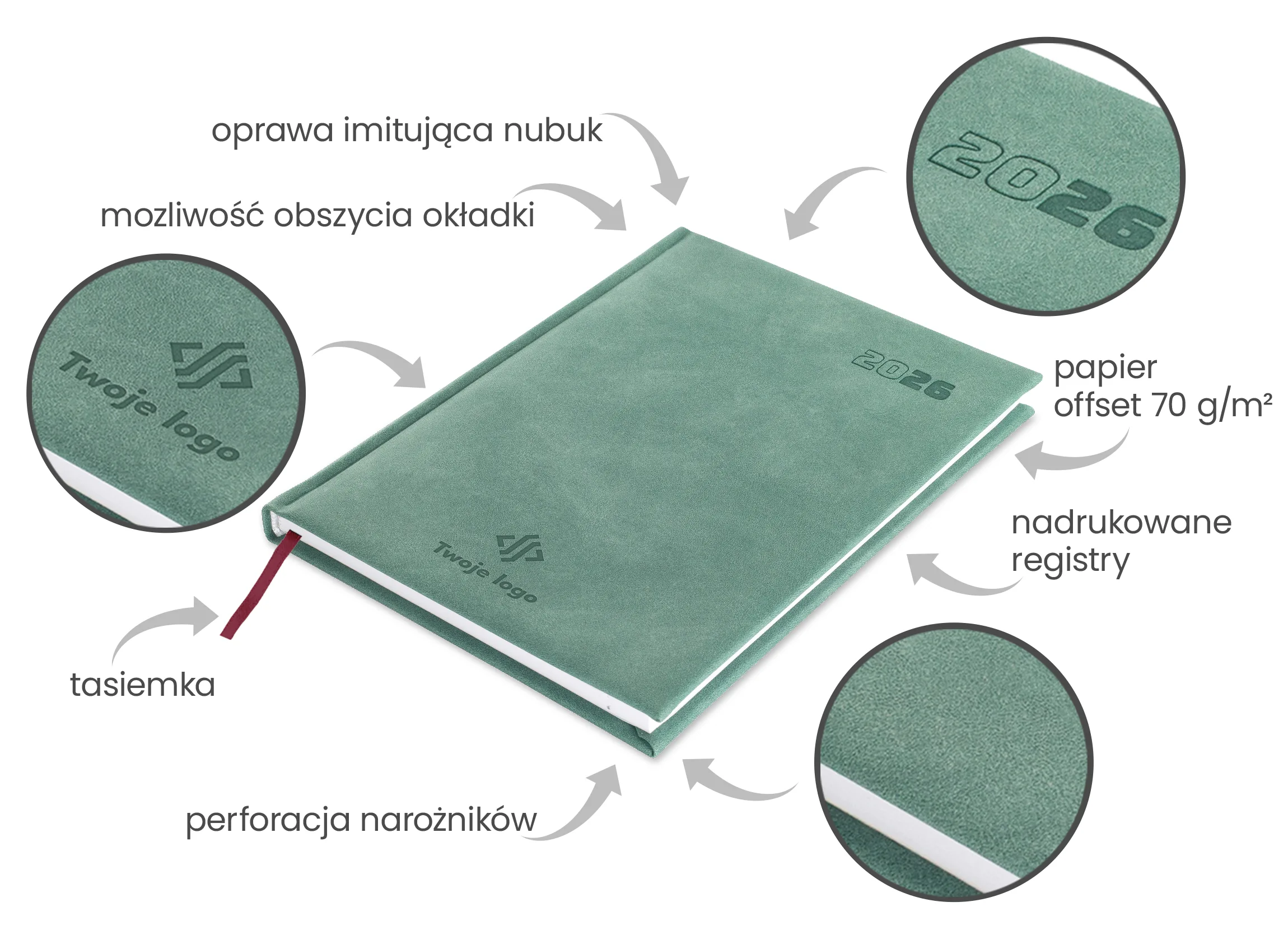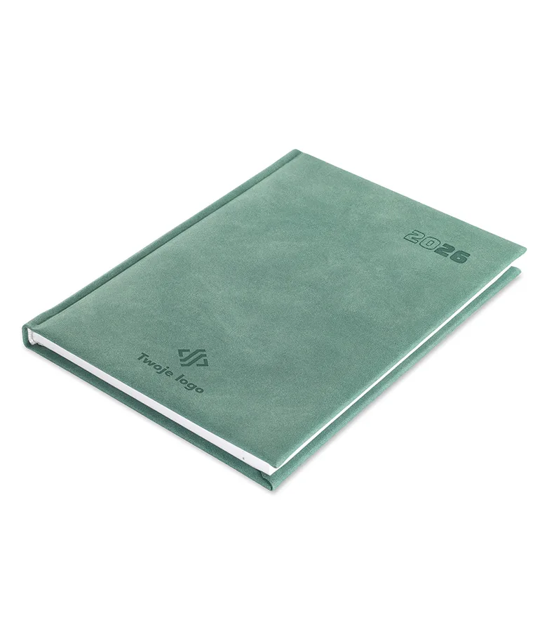 Kalendarz książkowy Nubuk A5 z logo to to bardzo miękka, puszysta oprawa imitująca nubuk. Oprawa  jest nieobszyta.