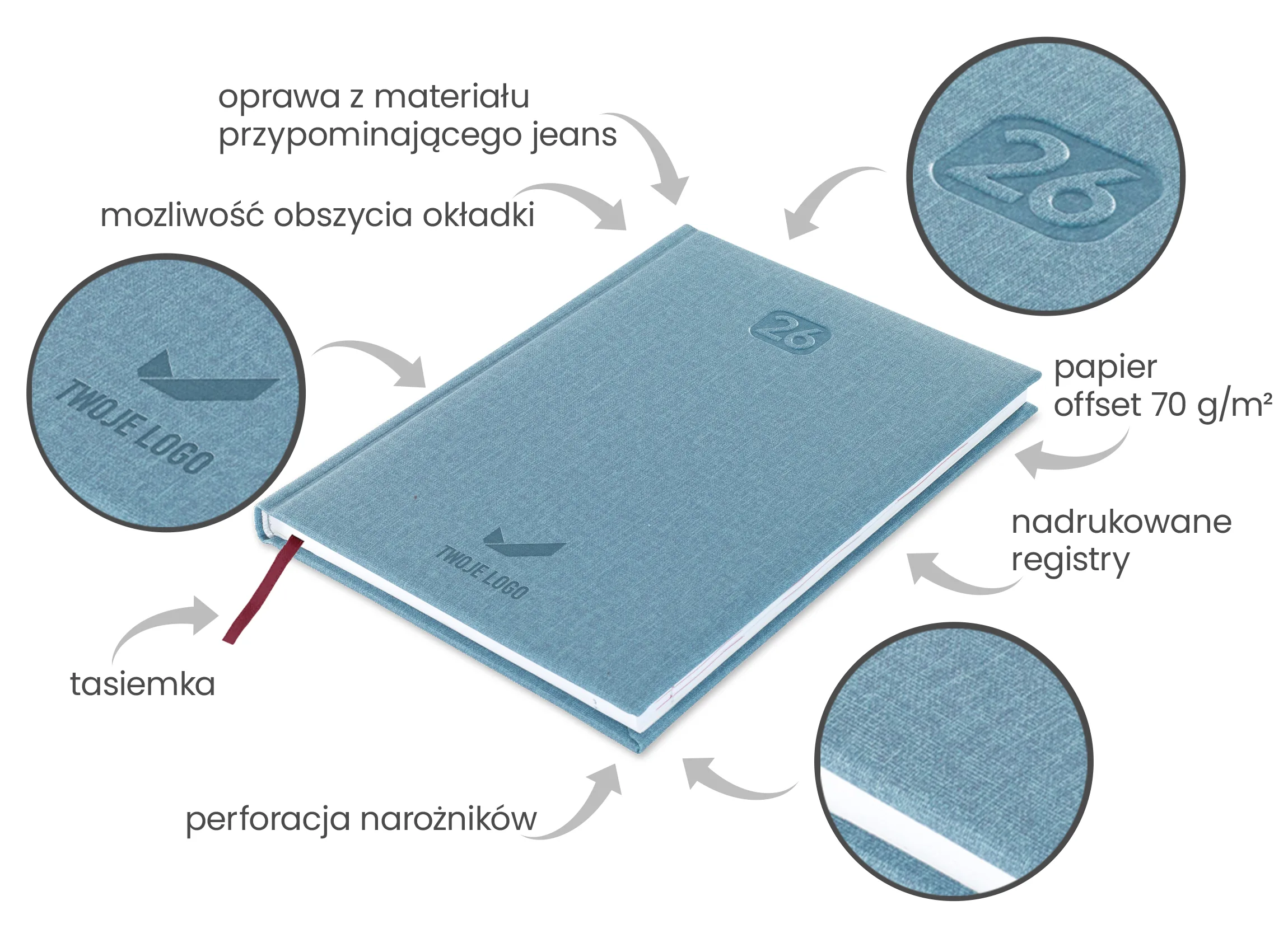 Na oprawie możemy nadrukować Twoje logo w pełnym kolorze aby jeszcze bardziej zachwycić wizualnie.