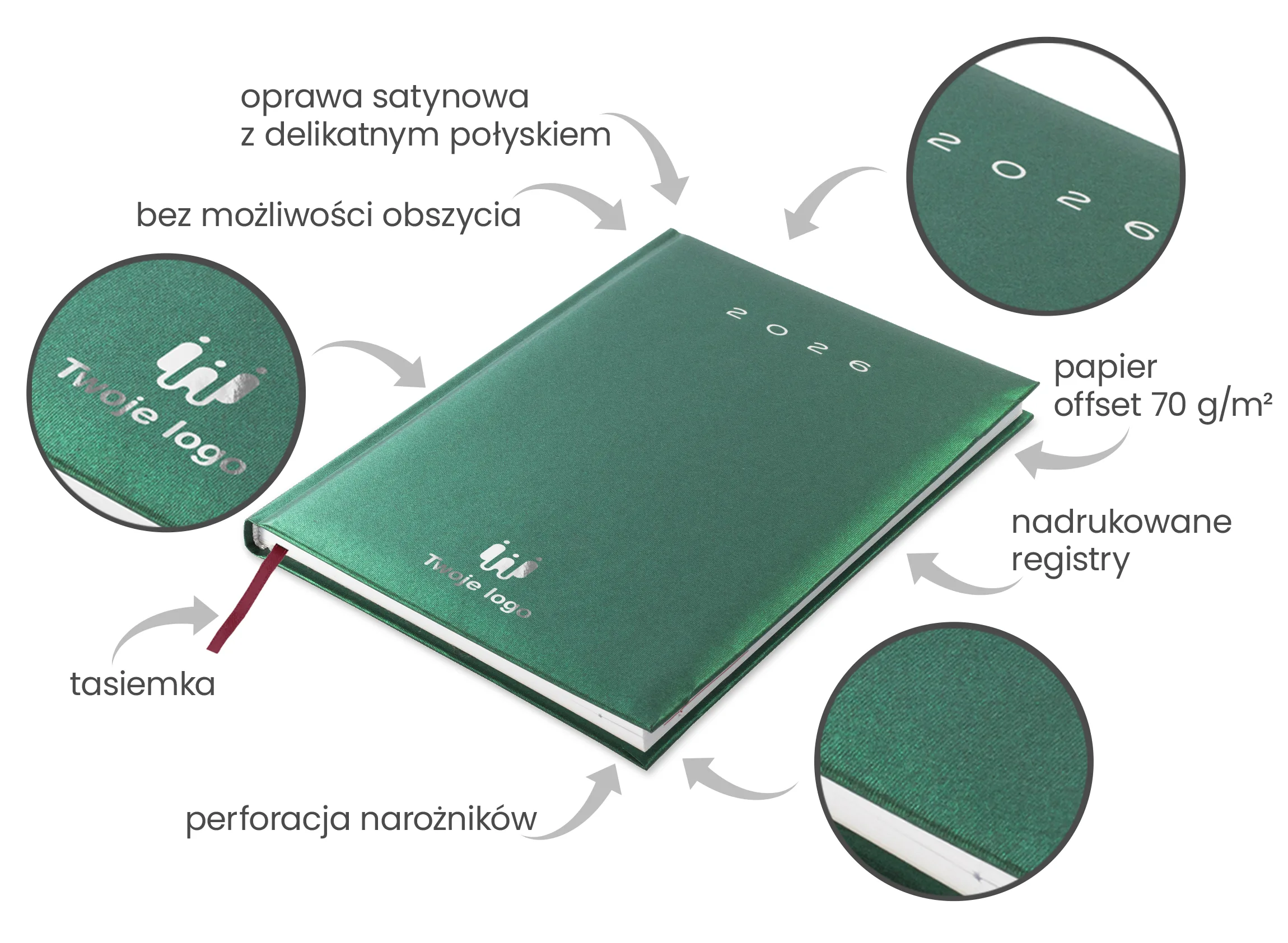 Kalendarz książkowy to nie tylko  doskonałe narzędzie do organizacji czasu, planowania i zapisywania codziennych zadań, ale także estetyczny dodatek do Twojego biura czy domu.  Zdecydowanie zwiększa on  produktywność planowania oraz działania.  Dodatkowo dzięki opcji personalizacji logo kalendarze są  doskonałą formą całorocznej reklamy, możesz podarować je swoim kontrahentom, partnerom biznesowym, klientom oraz pracownikom.   Sprawdzi się również jako podarunek na święta. Jego funkcjonalność i staranne wykonanie sprawią, że będziesz z niego zadowolony przez cały rok! ✨