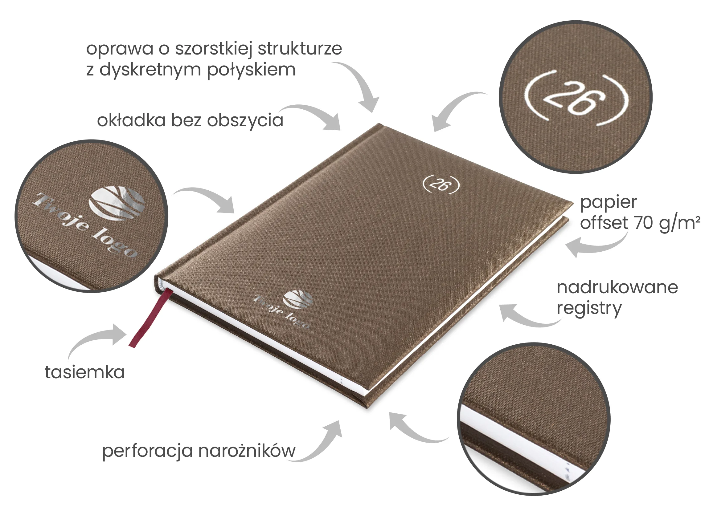 Kalendarz książkowy to nie tylko  doskonałe narzędzie do organizacji czasu, planowania i zapisywania codziennych zadań, ale także estetyczny dodatek do Twojego biura czy domu.  Zdecydowanie zwiększa on  produktywność planowania oraz działania.  Dodatkowo dzięki opcji personalizacji logo kalendarze są  doskonałą formą całorocznej reklamy, możesz podarować je swoim kontrahentom, partnerom biznesowym, klientom oraz pracownikom.   Sprawdzi się również jako podarunek na święta. Jego funkcjonalność i staranne wykonanie sprawią, że będziesz z niego zadowolony przez cały rok! ✨