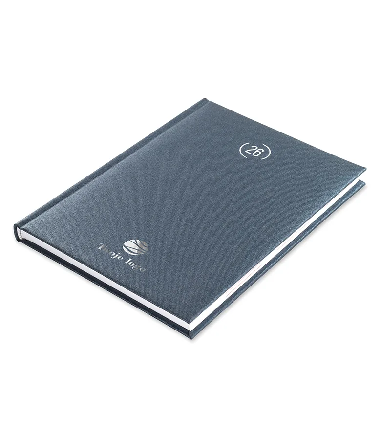 Kalendarz książkowy Salvador A5 z logo to oprawa która pomimo swej szorstkiej struktury w postaci drobnej siateczki zwraca uwagę swoim dyskretnym połyskiem. Okładka jest sztywna, wytrzymała i niewrażliwa na przetarcia. Tłoczenie tylko foliami metalizowanymi.
