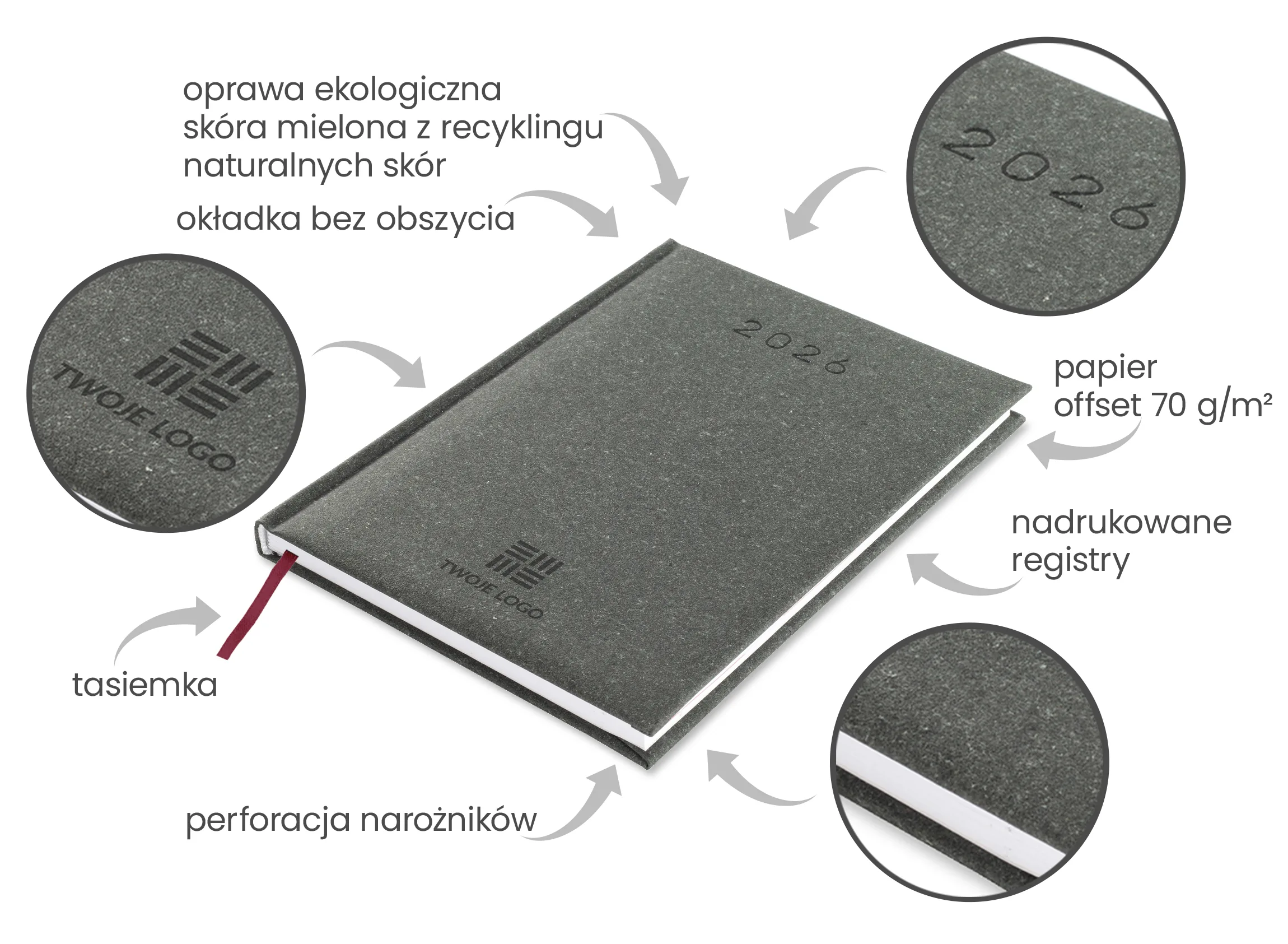 Kalendarz książkowy Skóra Eko A5 z logo to oprawa wykonana z ekologicznej skóry mielonej. Materiał wykorzystany do produkcji pochodzi z recyklingu skór naturalnych kalendarze spełniają rygorystyczne standardy UE oraz konsekwencji CITES.