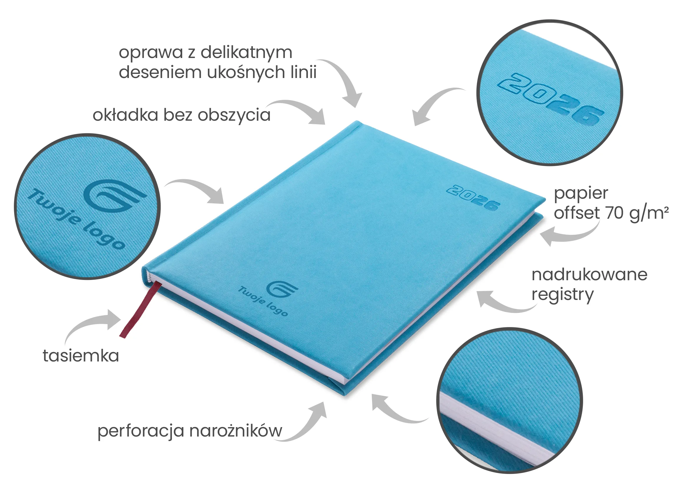 Na oprawie możemy nadrukować Twoje logo w pełnym kolorze aby jeszcze bardziej zachwycić wizualnie.