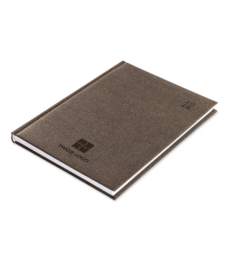 Kalendarz książkowy Utah A4 z logo to model kalendarza z miękką oprawą z wyraźnym deseniem grubego płótna na bazie mocnego papieru termoprzebarwialnego.