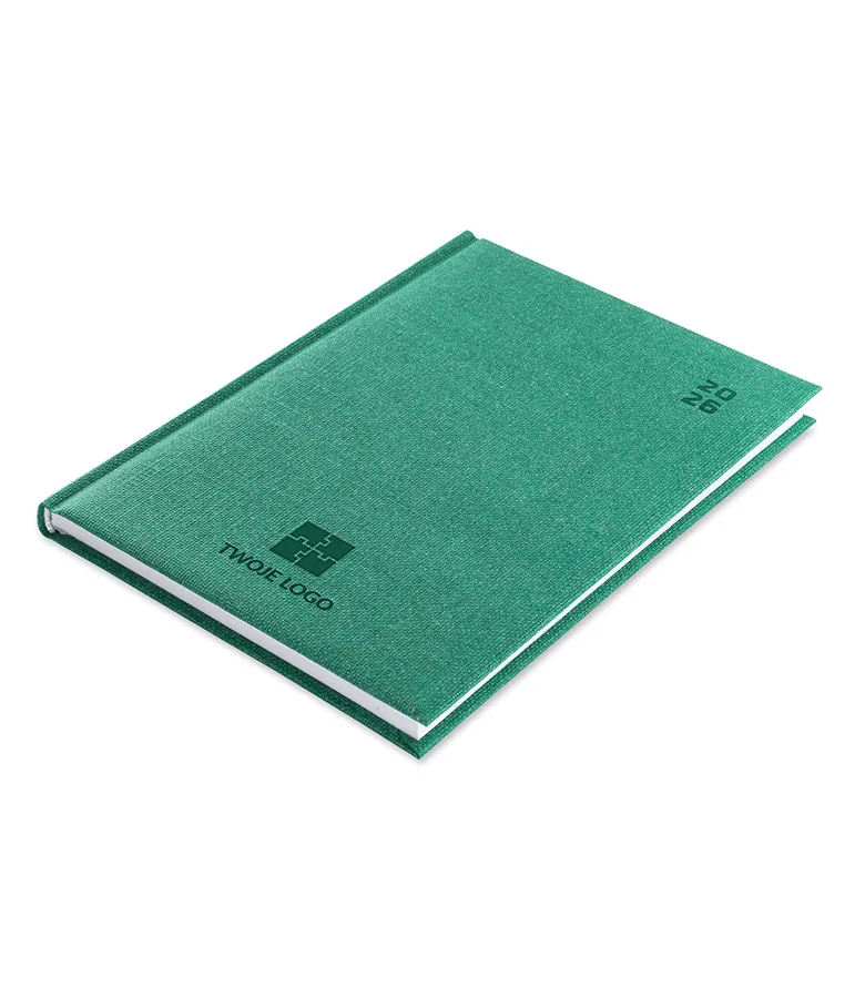 Kalendarz książkowy Utah A5 z logo to model kalendarza z miękką oprawą z wyraźnym deseniem grubego płótna na bazie mocnego papieru termoprzebarwialnego.