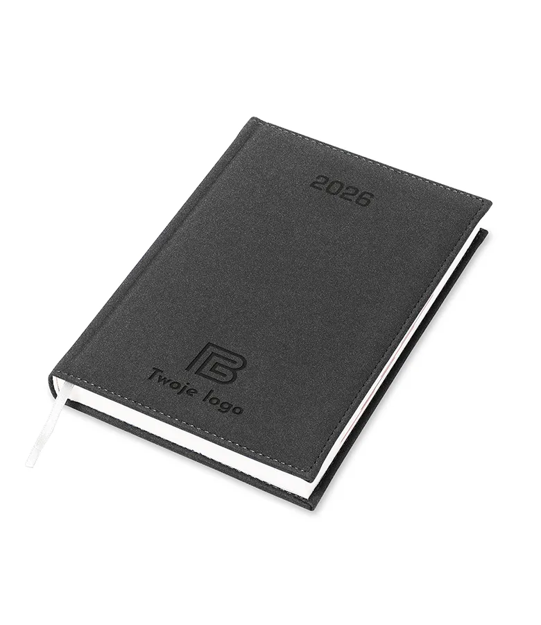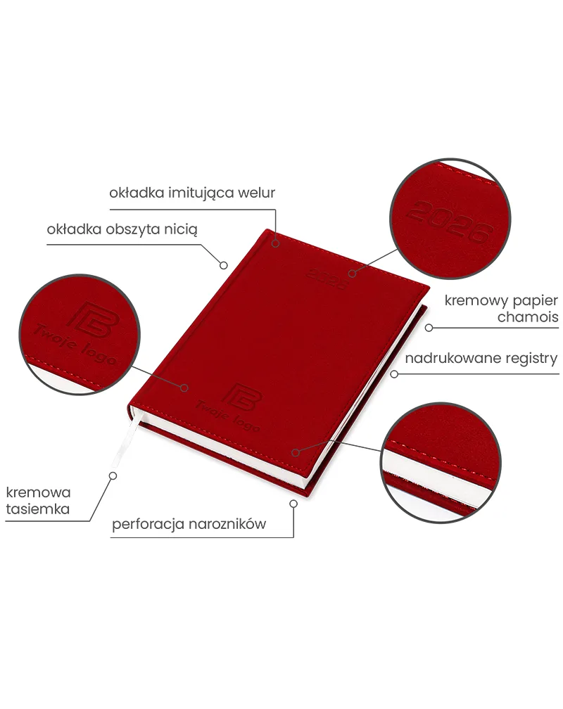 Kalendarz książkowy Velour B5 z logo to model kalendarza, który zachwyca swoją miękką w dotyku oprawą imitującą welur. Posiada w wytłoczoną datę na okładce oraz proste narożniki, ten kalendarz jest nie tylko praktyczny, ale także elegancki. Okładka obszyta nicią gwarantuje trwałość i wytrzymałość kalendarza.