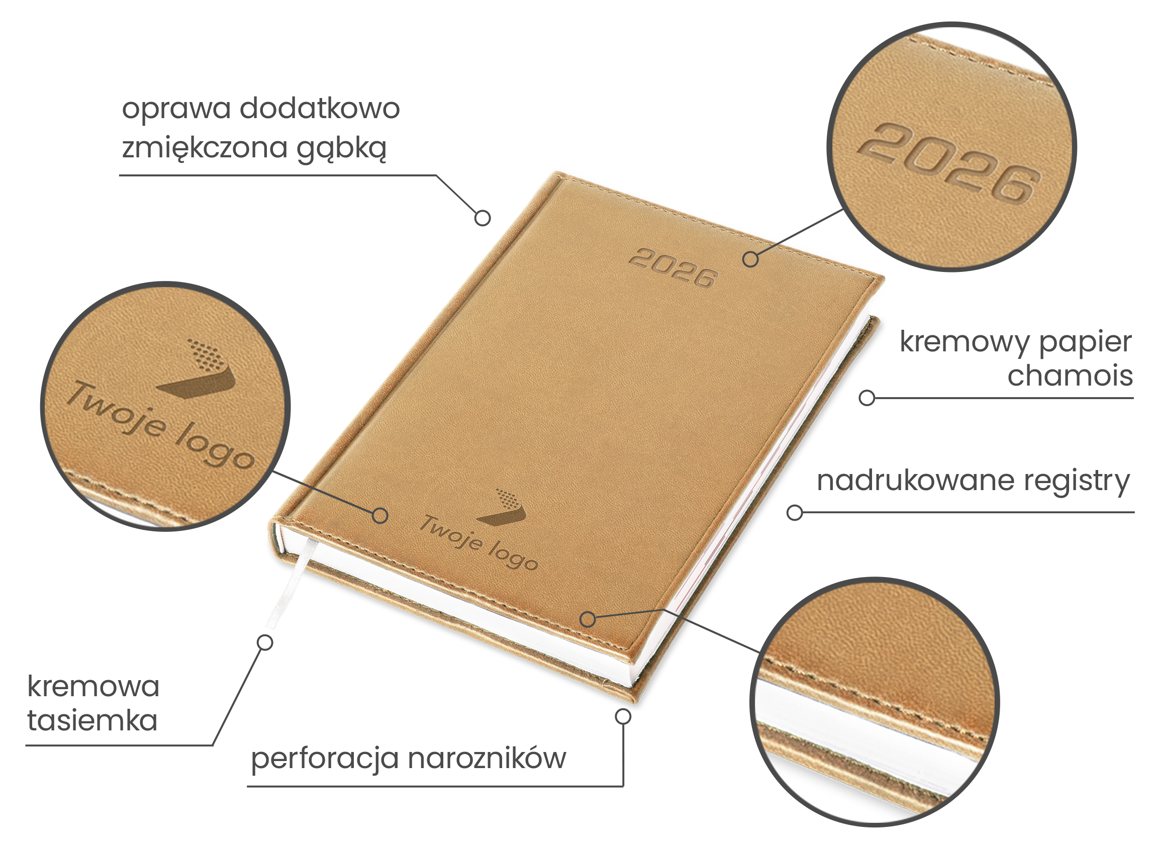 Wyróżnij swój kalendarz efektownym nadrukiem logo w technologii UV – w pełnym kolorze. To elegancki detal, który przyciąga wzrok i podkreśla profesjonalny charakter Twojej marki.